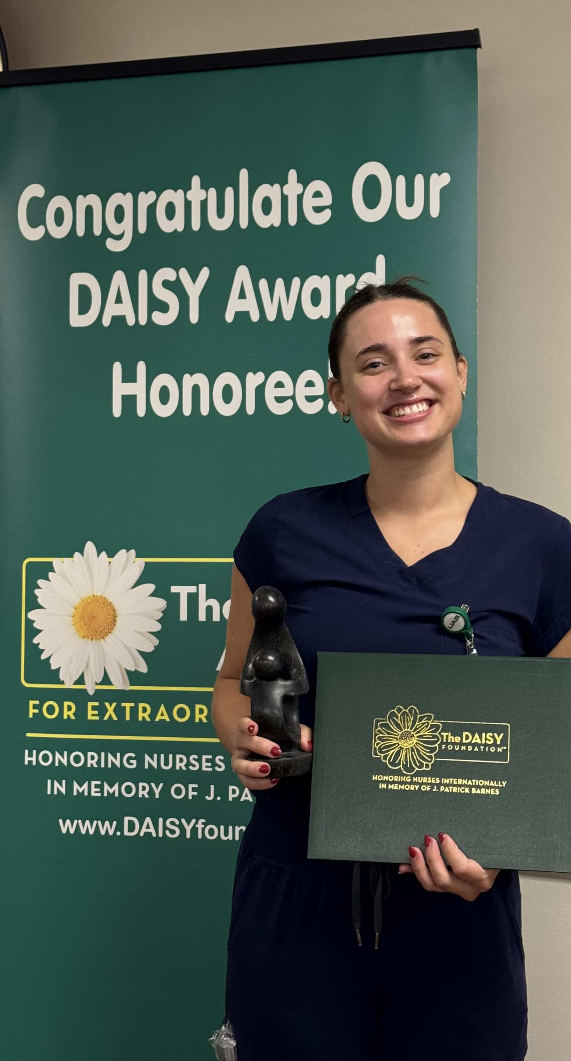 The DAISY Award recognizes the extraordinary care and compassion that nurses provide for patients and families every day. Submissions and stories are reviewed each month, and the winner is surprised at a special ceremony. You can nominate a nurse to be honored with The DAISY Award by using this form.